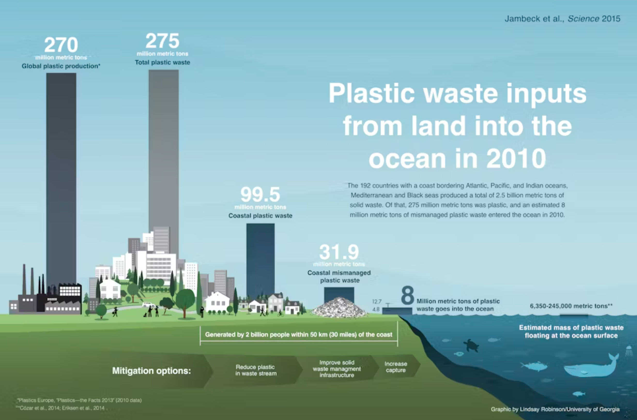 با این حال، مردم ایالات متحده – که در رتبه ۲۰ قرار دارند و کمتر از ۱٪ از زباله‌های جهانی را تولید می‌کنند – روزانه بیش از ۲.۵ کیلوگرم زباله پلاستیکی تولید می‌کنند که بیش از دو برابر سرانه تولید زباله در چین است. اگرچه این اخبار برای  حیات وحش دریایی، پرندگان دریایی و شیلات خوب نیستند، اما این تحقیق راه را برای بهبود مدیریت جهانی پسماند و کاهش تولید زباله های پلاستیک هموار می‌کند.